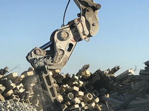 Les poteaux et traverses collectés sont broyés pour obtenir une granulométrie de 0-300 mm à l’aide de pelle de 24 T équipée d’un croc béton. Les ferrailles sont extraites lors de cette phase de broyage.